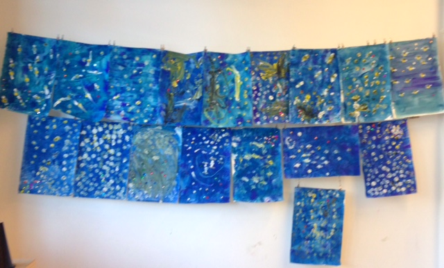 Arts Enrichment and Art Sparks have been painting using sponge rollers, pom poms and pencil grips to create an early evening sky with glowing fire flies inspired by The Brightest Star.